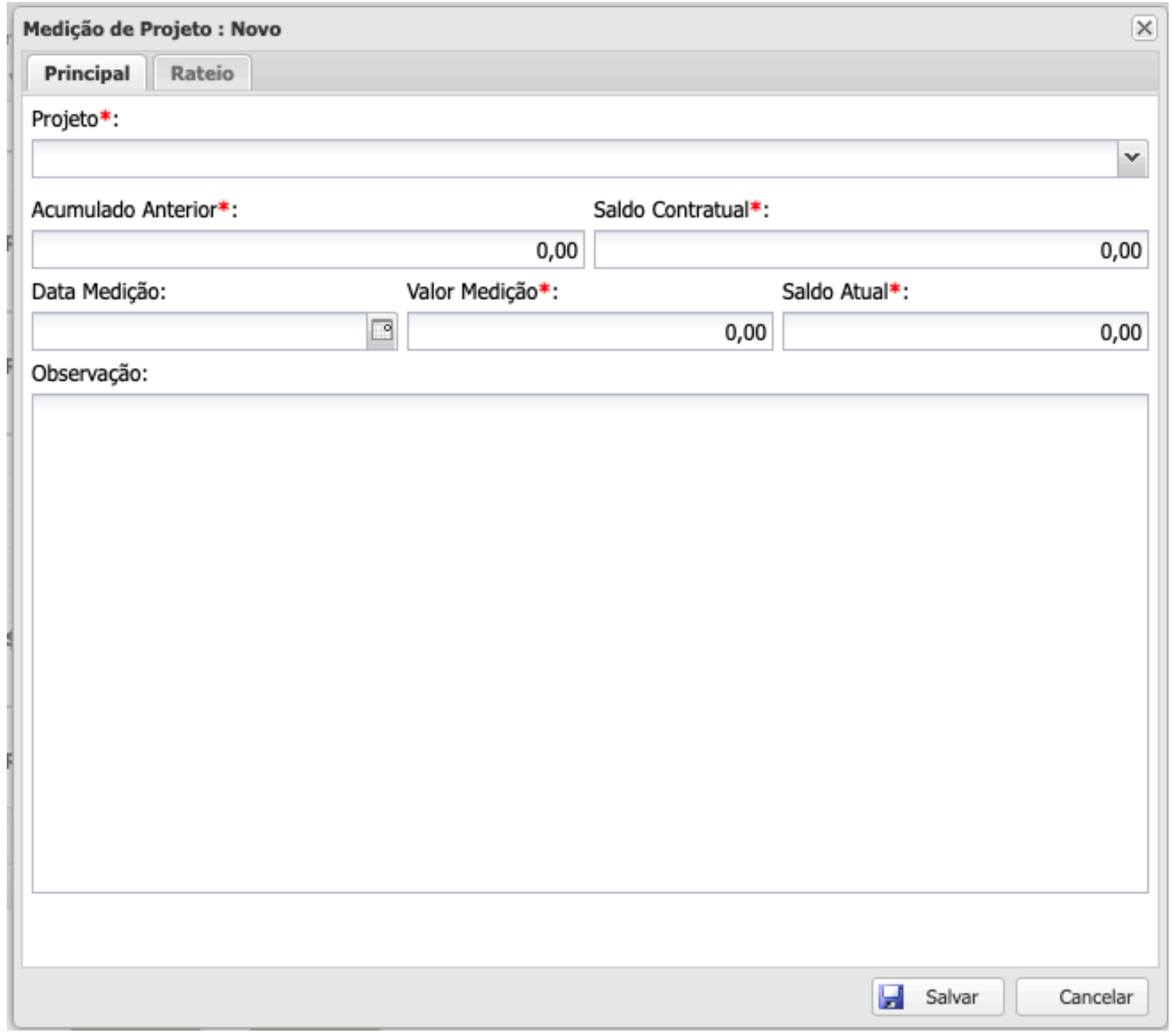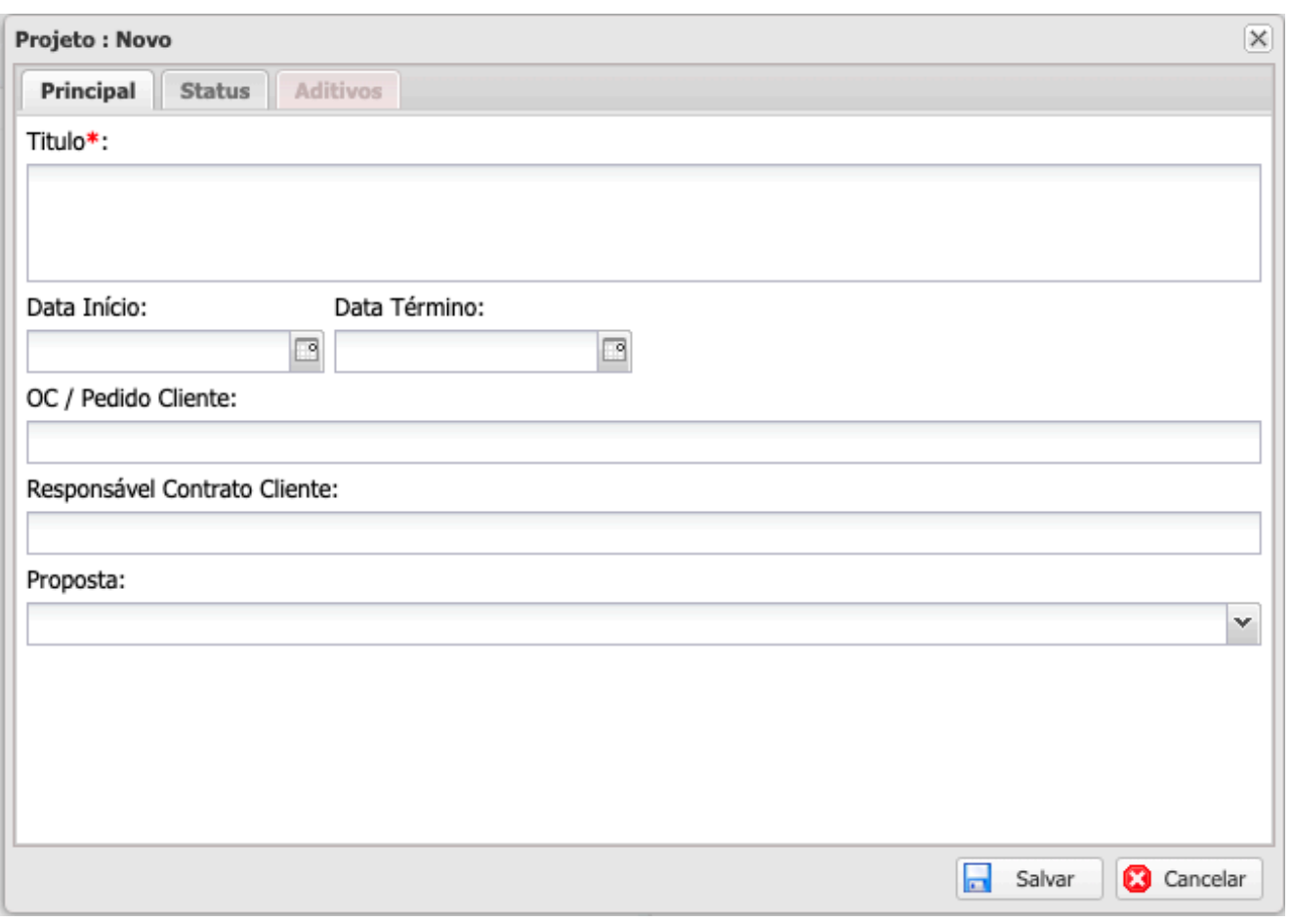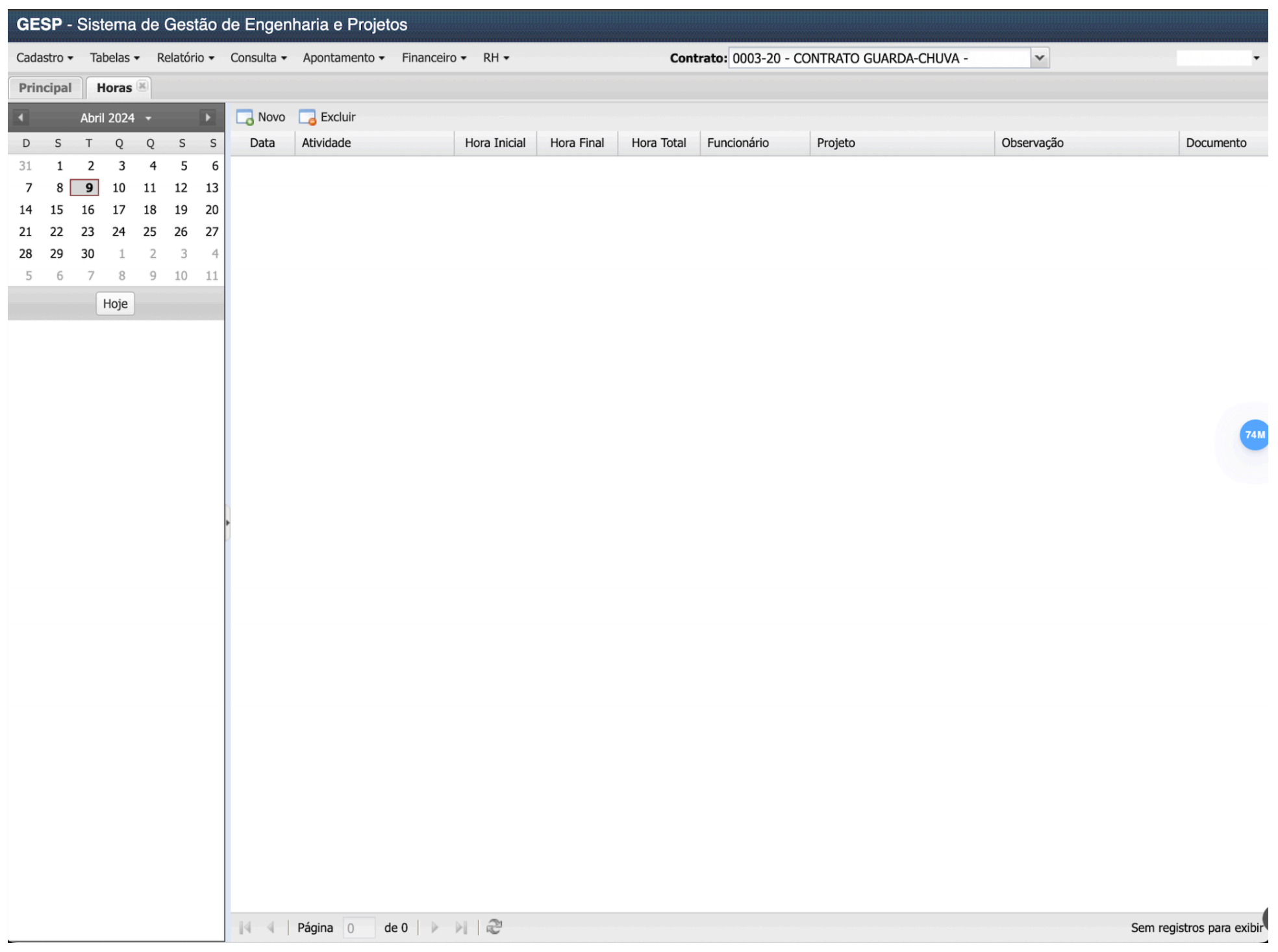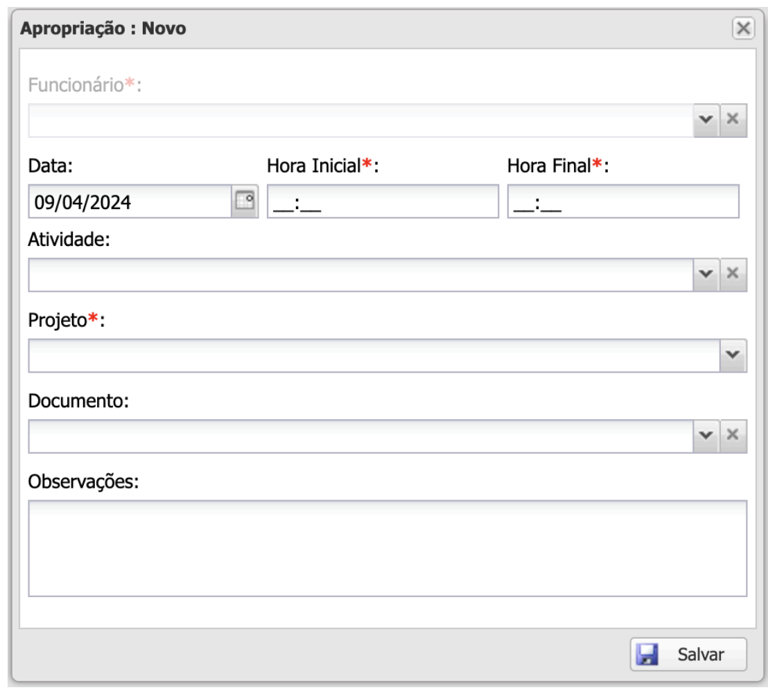 Para registrar um apontamento de horas, clique no botão Novo e será exibido o seguinte formulário.