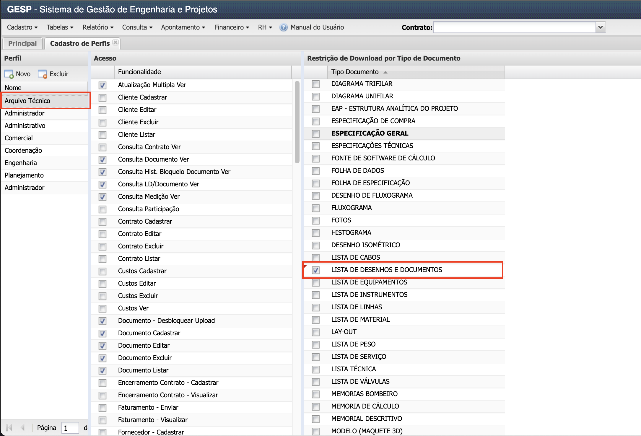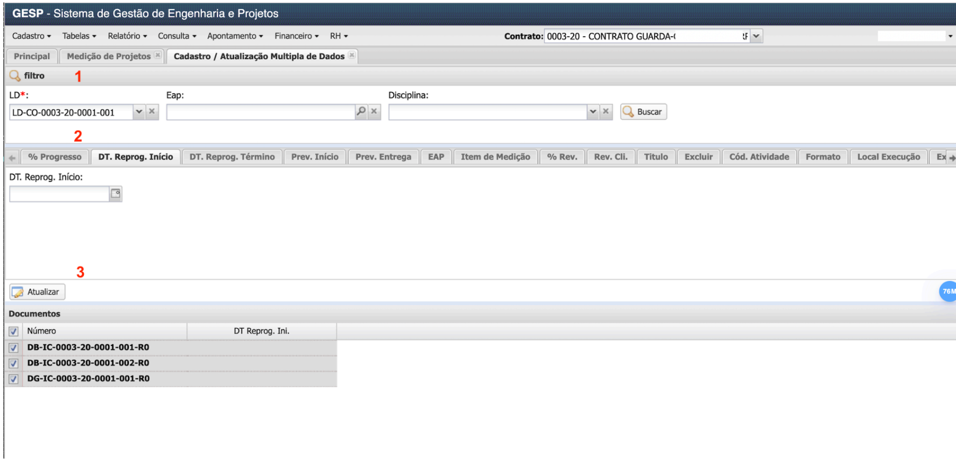 Para emitir um ou mais documentos, é necessário que estes estejam previamente cadastrados em uma LD (Lista de Documentos). Na barra superior do sistema, selecione o contrato ao qual os documentos pertencem.