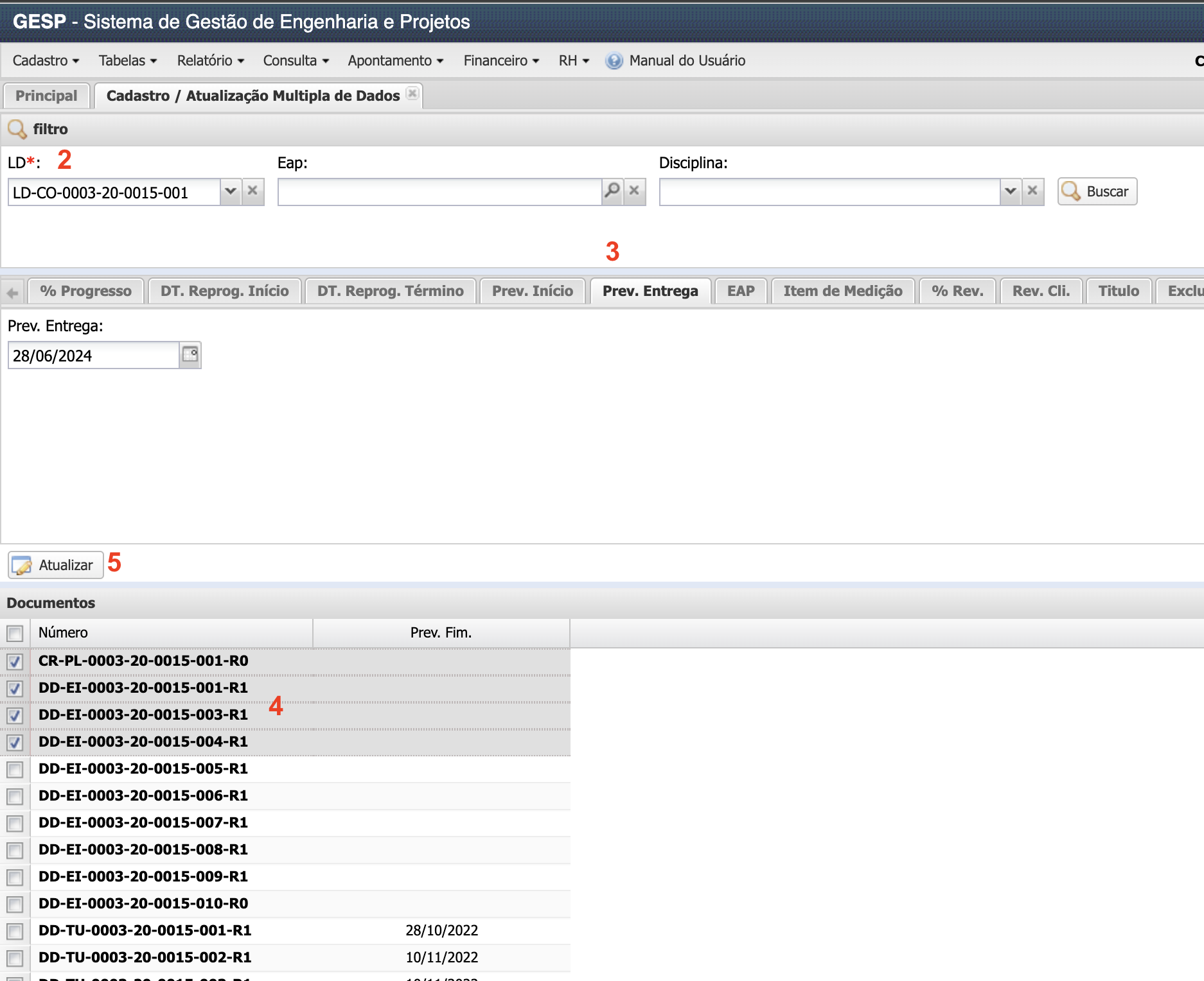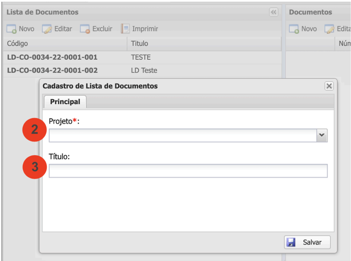 Será exibido o formulário para cadastro de uma LD, (2) selecione o projeto desejado para qual a LD ficará