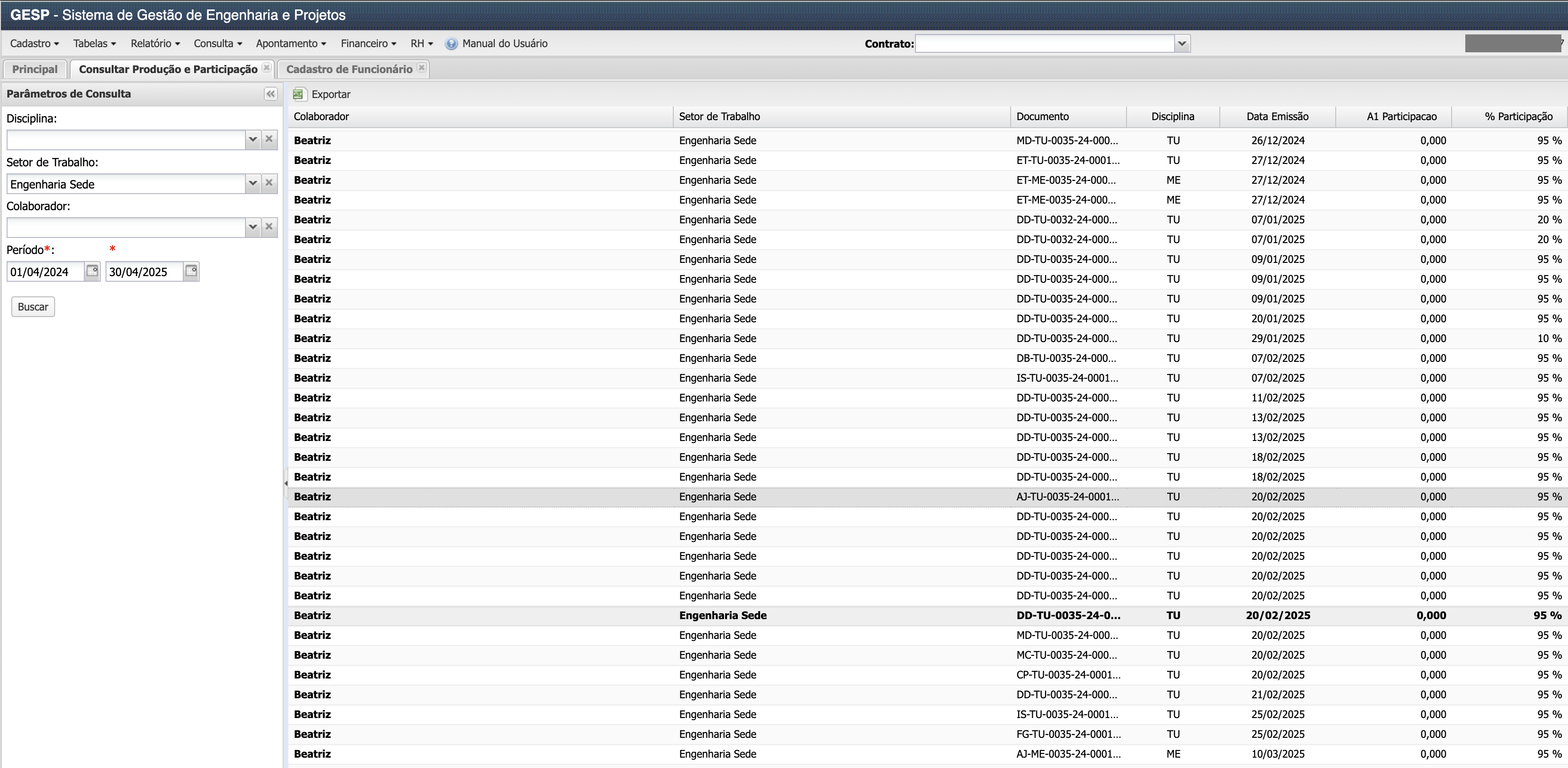 O módulo de Gestão de Produtividade do sistema permite o registro e acompanhamento detalhado da participação dos colaboradores na elaboração de documentos técnicos.