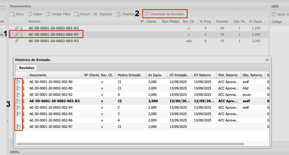 Dentro do Painel de Documentos, localize a seção GRD (1). Para realizar a emissão, arraste os documentos desejados para esta área. Somente após essa ação os documentos estarão prontos para serem emitidos.