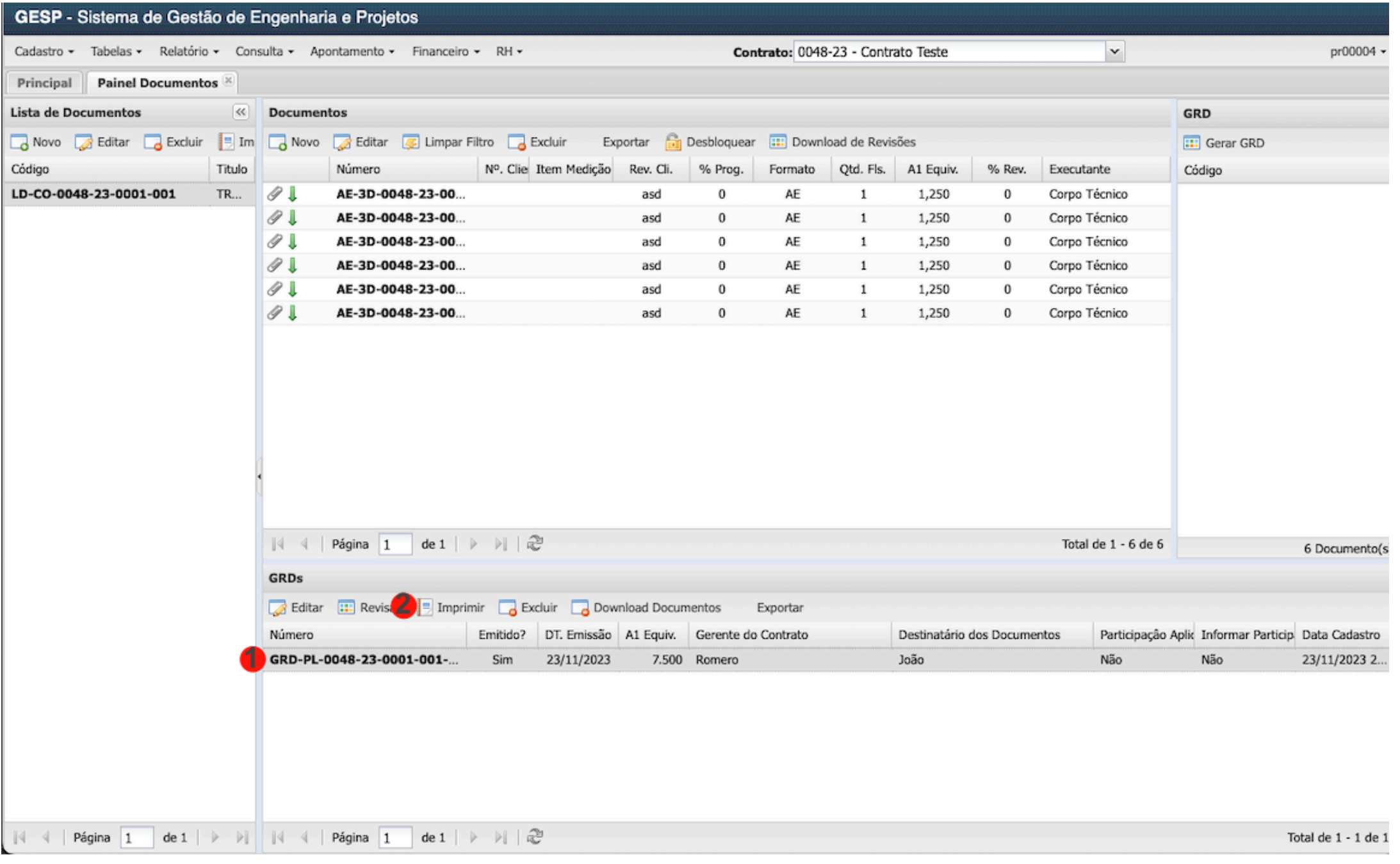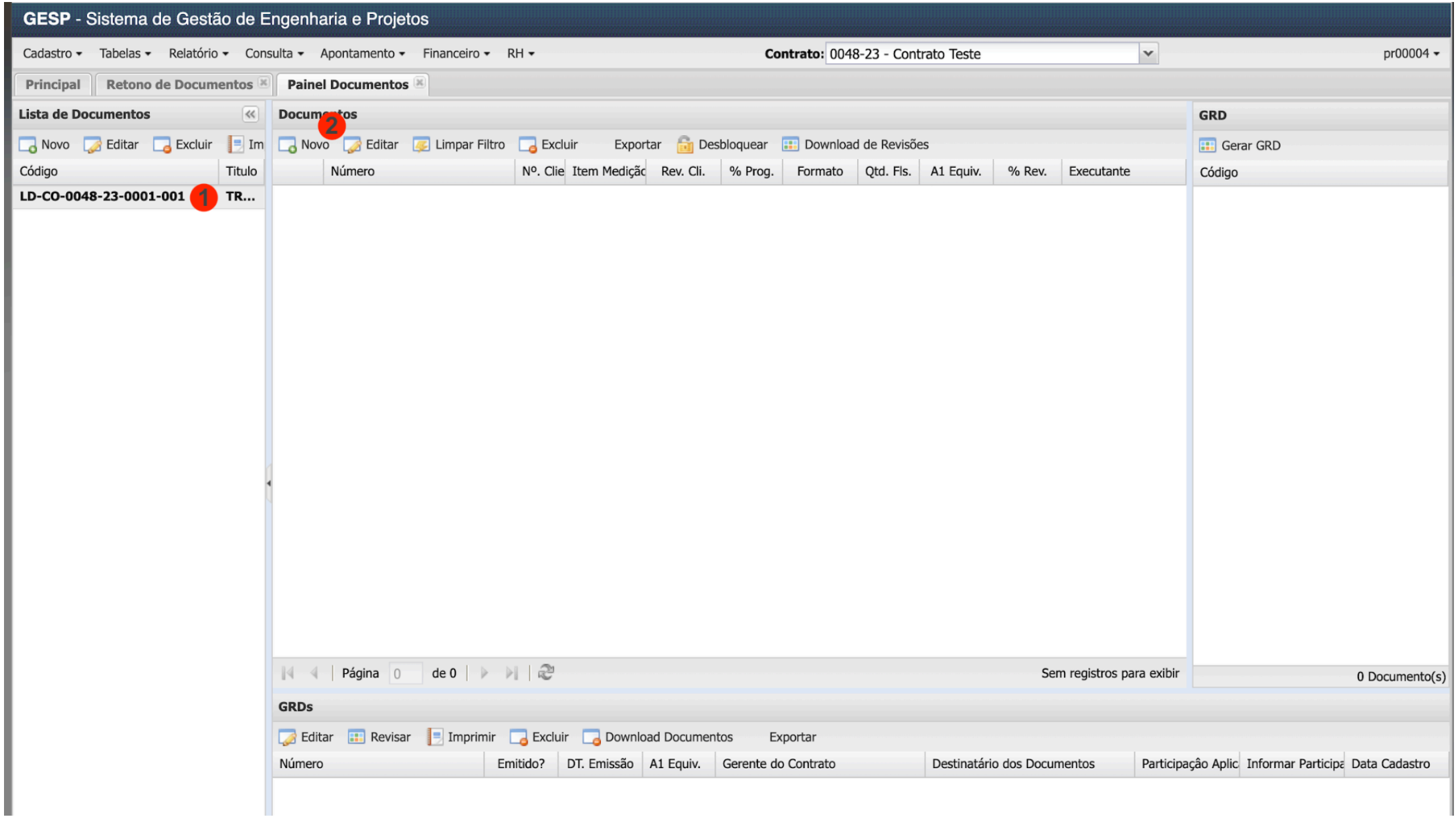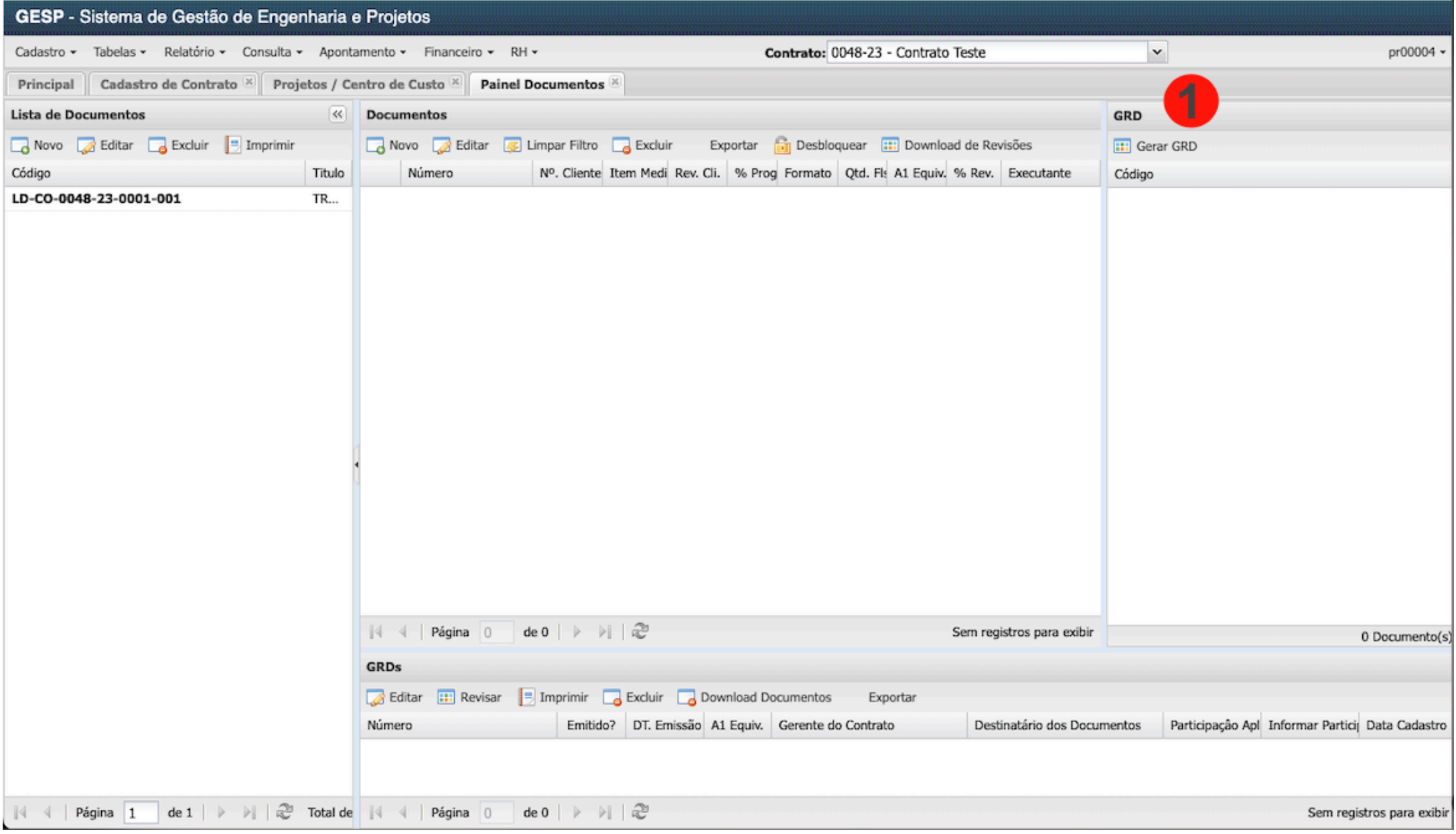 Após selecionar um contrato, clique no menu Cadastro -> LD / Documentos / GRD e, será exibida a tela