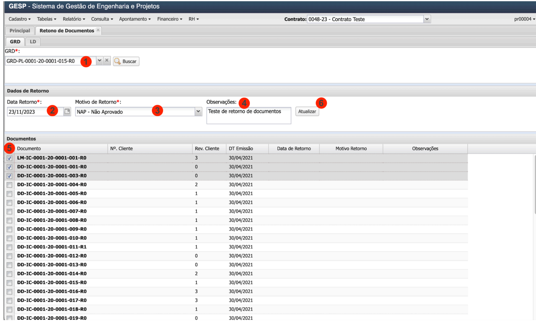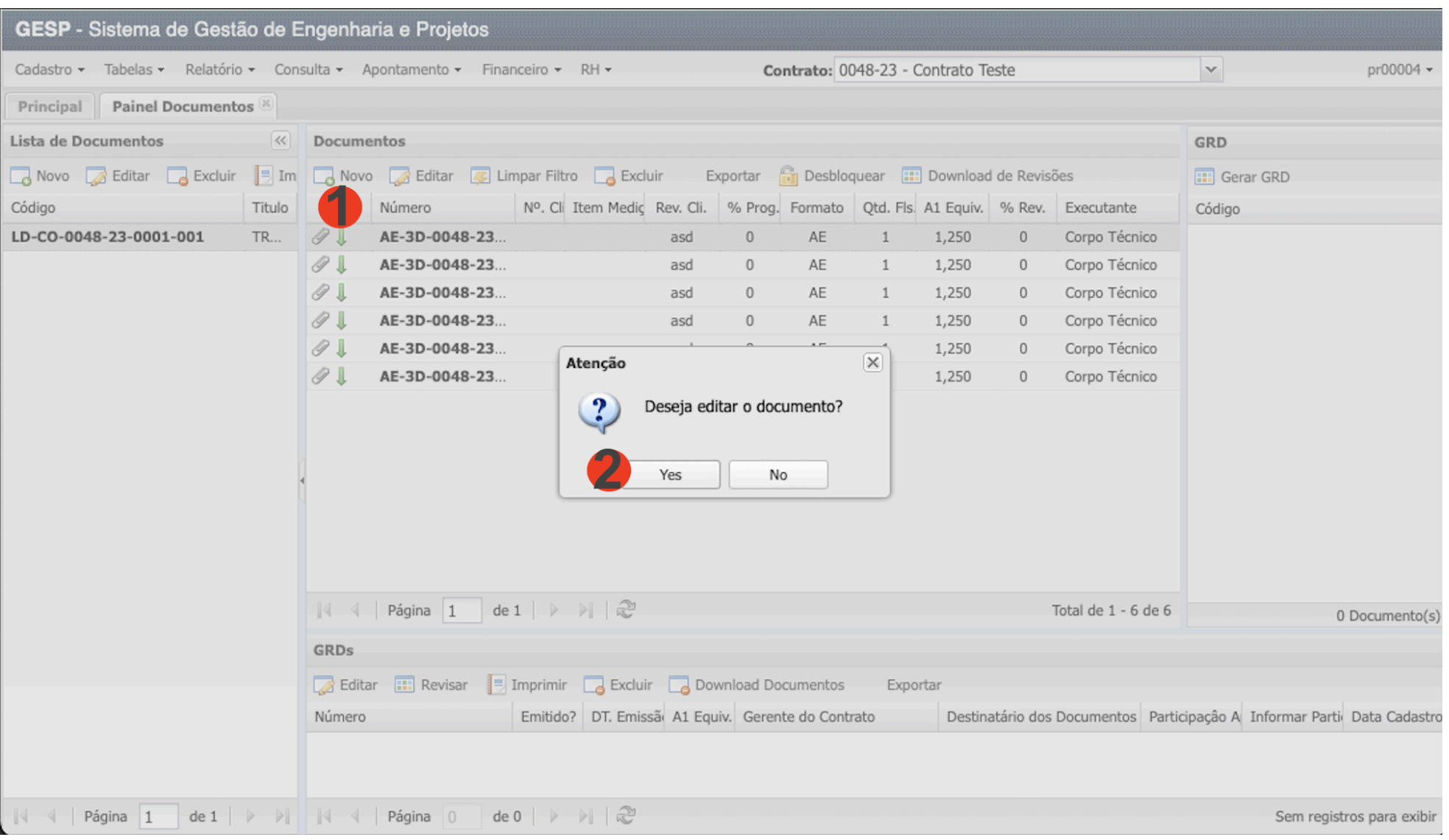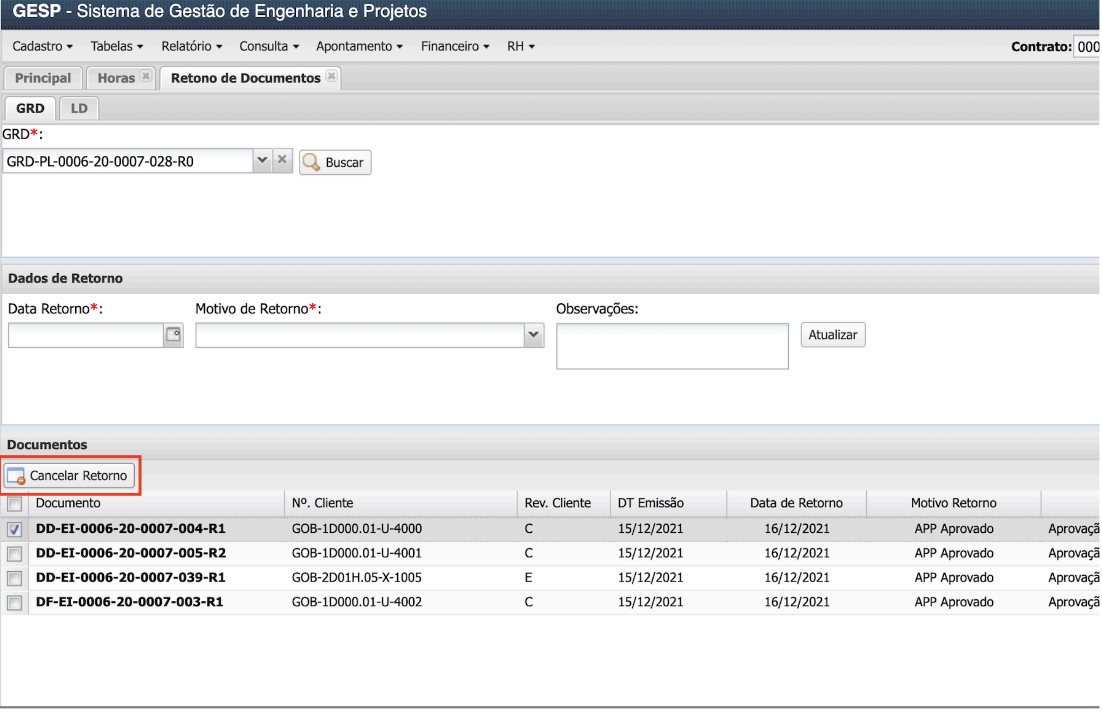 Após selecionar um contrato, clique no menu Cadastro -> LD / Documentos / GRD e, será exibida a tela