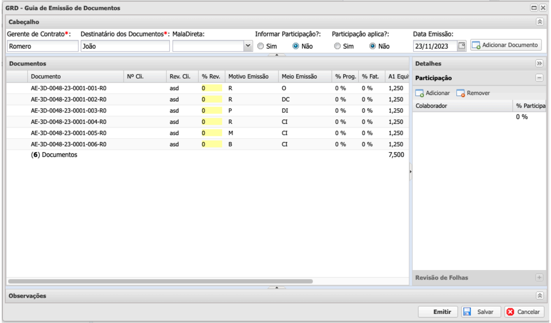 Para todos os documentos emitidos no sistema, é possível registrar os colaboradores que participaram da sua elaboração, com um limite de até 3 participantes por documento. Para cada participante, deve ser informado o respectivo percentual de participação.