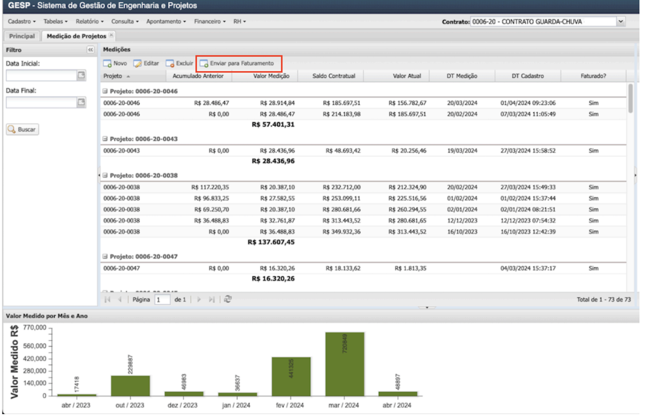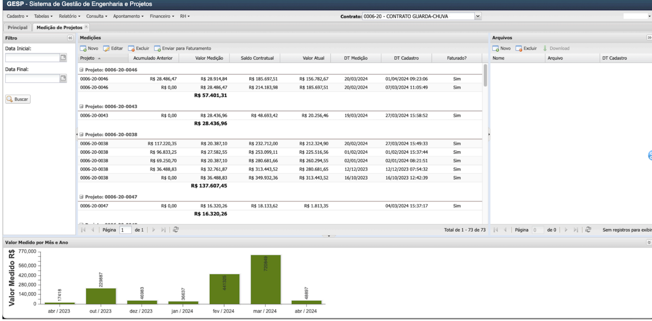 Aplicação de filtros por período, colaborador, projeto, tipo de documento, entre outros;